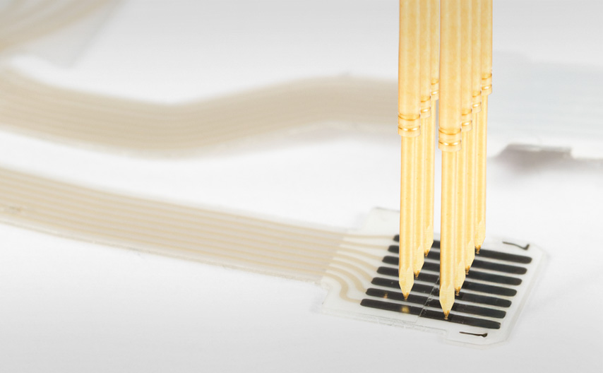 The flexibility of FPCs makes precise, reproducible contacting of the test points difficult. Due to their minimal material thickness (< 0.5 mm), spring-loaded test probes must be designed to ensure that they reliably contact the test points without damaging the FPCs - especially due to excessive spring force or aggressive tip styles.