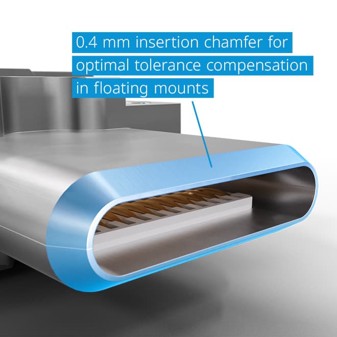 - Enlarged insertion chamfer, up to 0.4 mm tolerance compensation with floating mounting