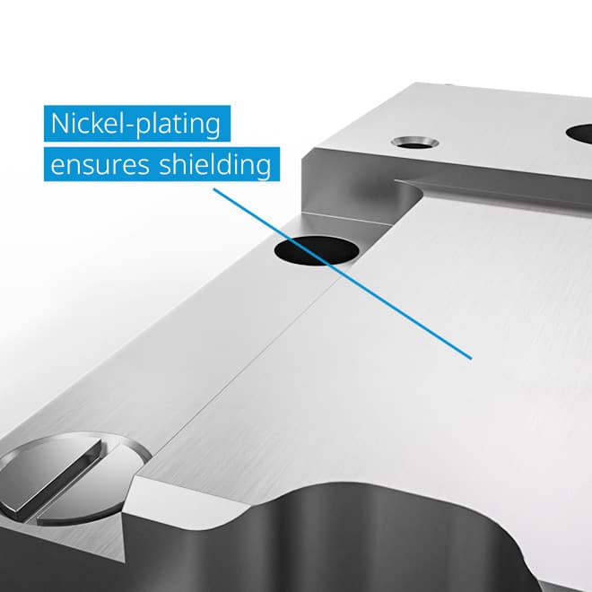 The robust aluminium housing is specifically designed for intensive use in the testing industry and offers maximum durability. It ensures long-lasting and reliable performance for maximum efficiency and reduced downtime. The nickel coating optimises the shielding properties and resistance to electromagnetic interference.