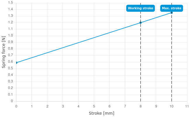 - Spring force at working stroke: 1.2 N [4.31 ozf]