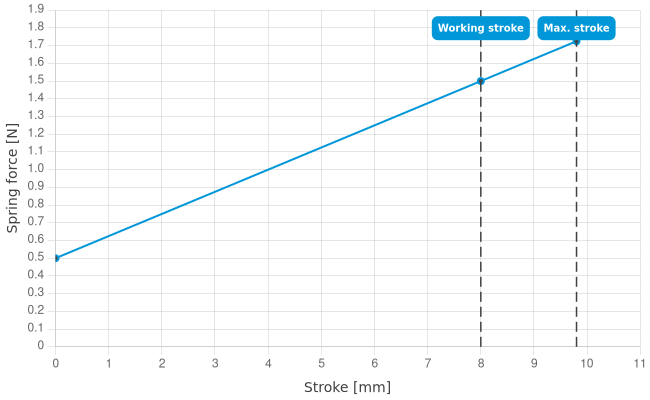 - Spring force at working stroke: 1.5 N [5.39 ozf]