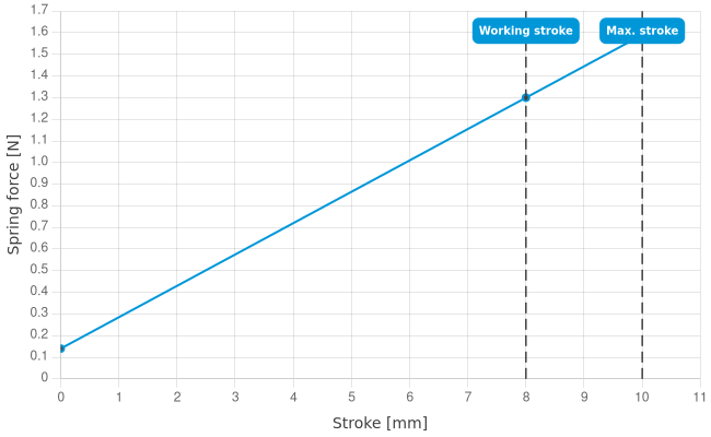 - Spring force at working stroke: 1.3 N [4.67 ozf]