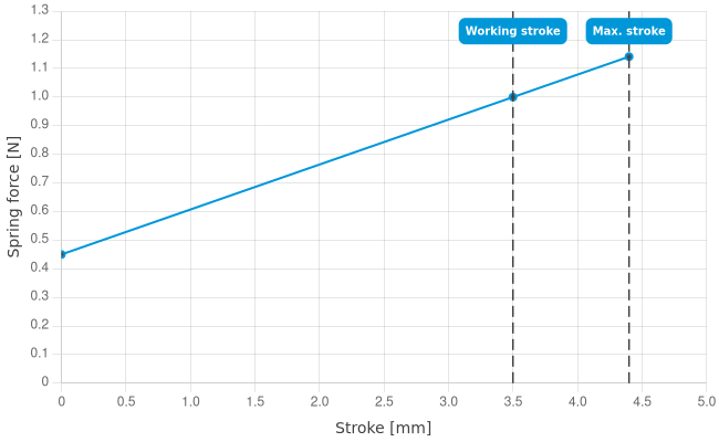 - Spring force at working stroke: 1 N [3.59 ozf]